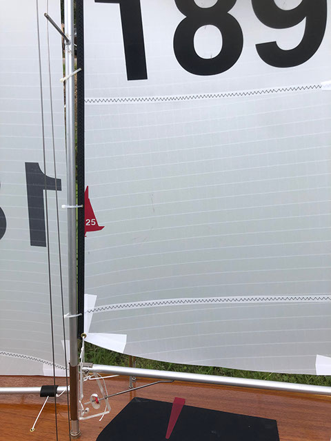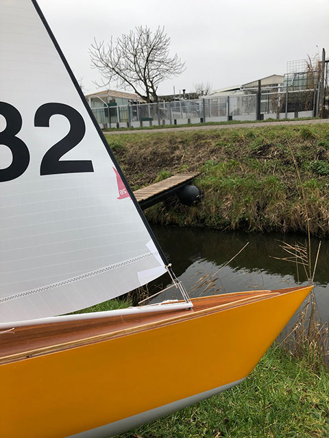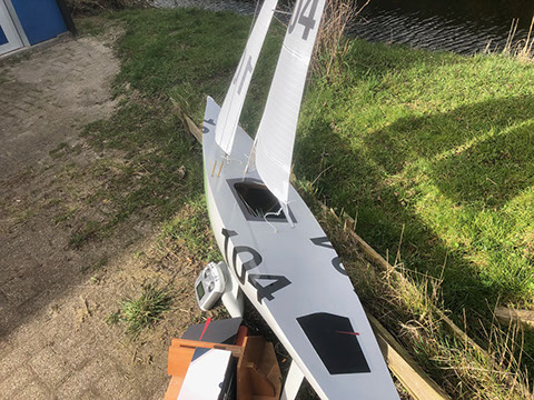 Eigenlijk het meest kwetsbare onderdeel van de boot. (het motortje) Na veel gebruik komen er horizontale sporen in het achterlijk van de fok en met grootzeil. Dit is niet meer te herstellen. Handig is om dit setje als hard weer zeil achter de hand te houden. Het rode teken in het voorlijk van de fok en grootzeil geeft het jaartal aan (17 staat dus voor 2017) Het sign zit in de zeilen vanaf 2002 (02)